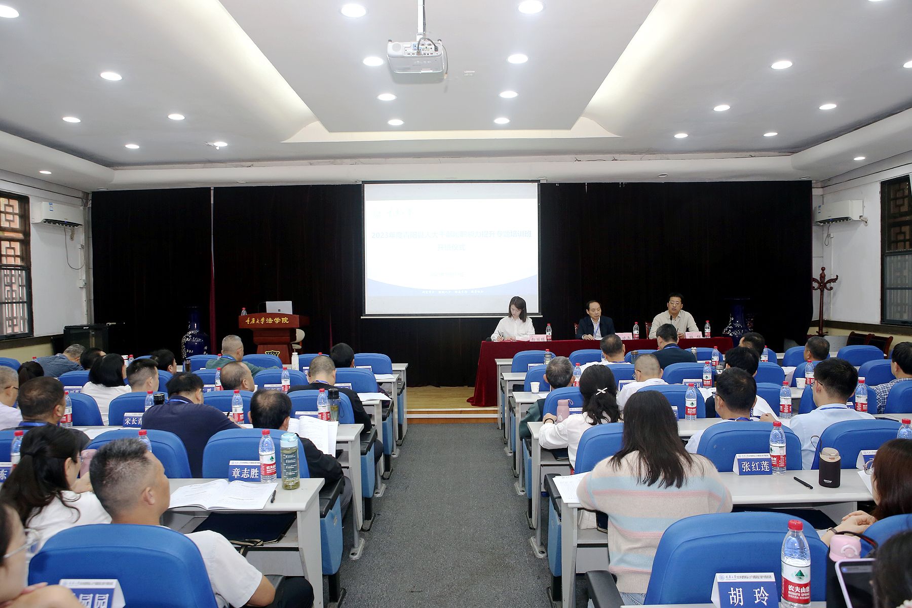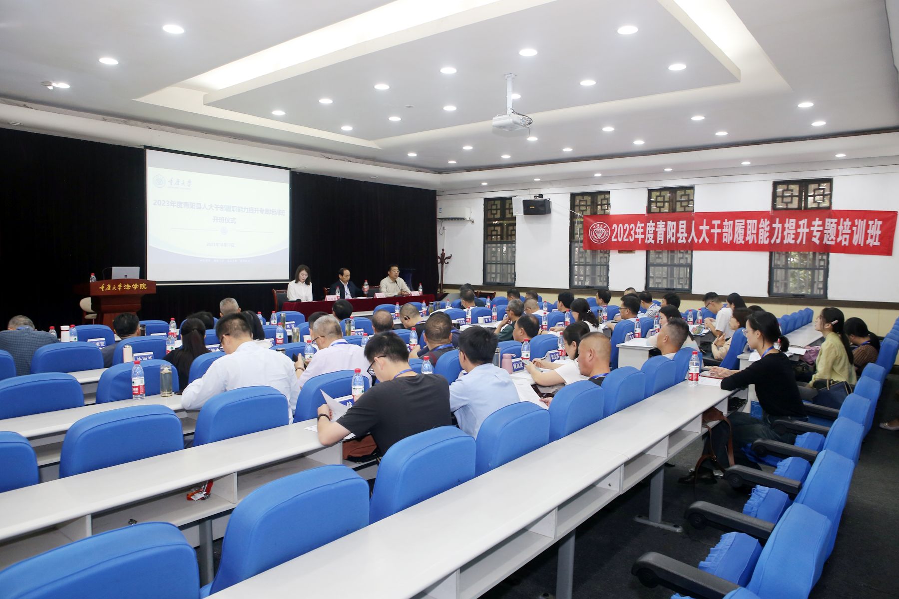 2023年10月17日上午,2023年度青阳县人大干部履职能力提升专题培训班在重庆大学顺利开班。重庆大学法学院副院长杜辉、青阳县人大常委会党组书记、主任杨晓兵共同出席开班仪式,全班42名学员参加,开班仪式由重庆大学法学院培训部主任向丽绢主持。