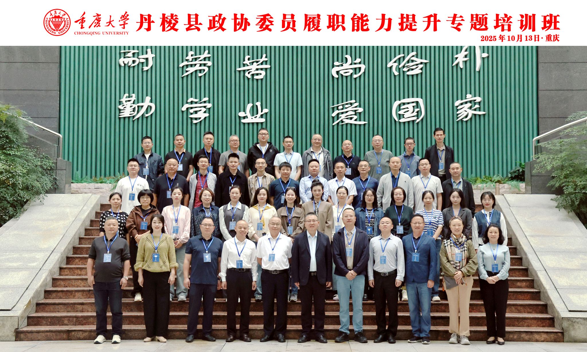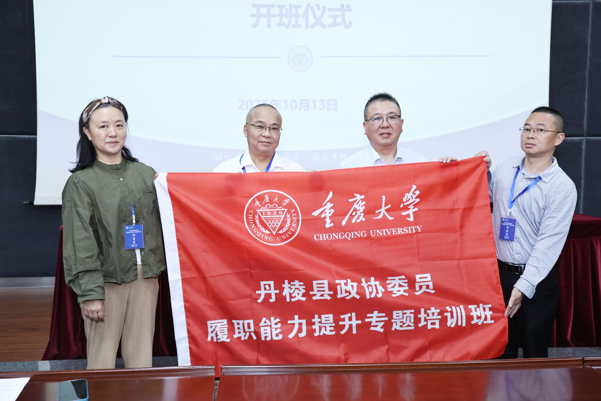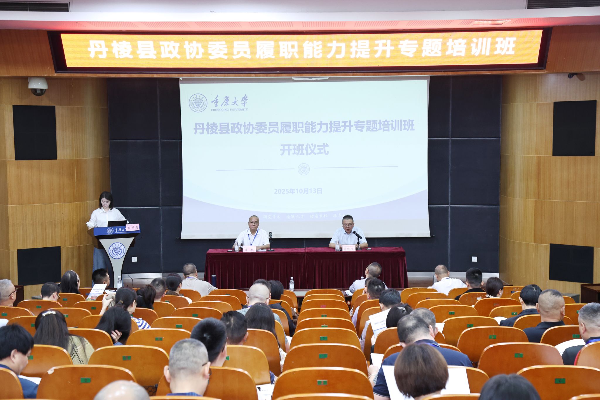2025年10月13日上午,丹棱县政协委员履职能力提升专题培训班在重庆大学顺利开班。重庆大学法学院党委书记蒋研川,丹棱县政协党组成员、副主席鲁华出席开班仪式,丹棱县政协委员49名学员参加培训,开班仪式由重庆大学法学院培训部主任向丽绢主持。