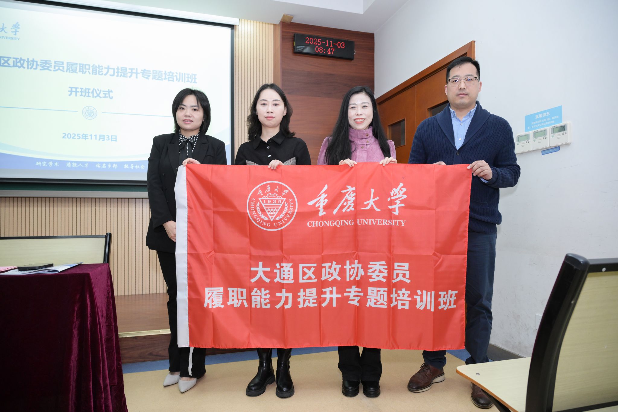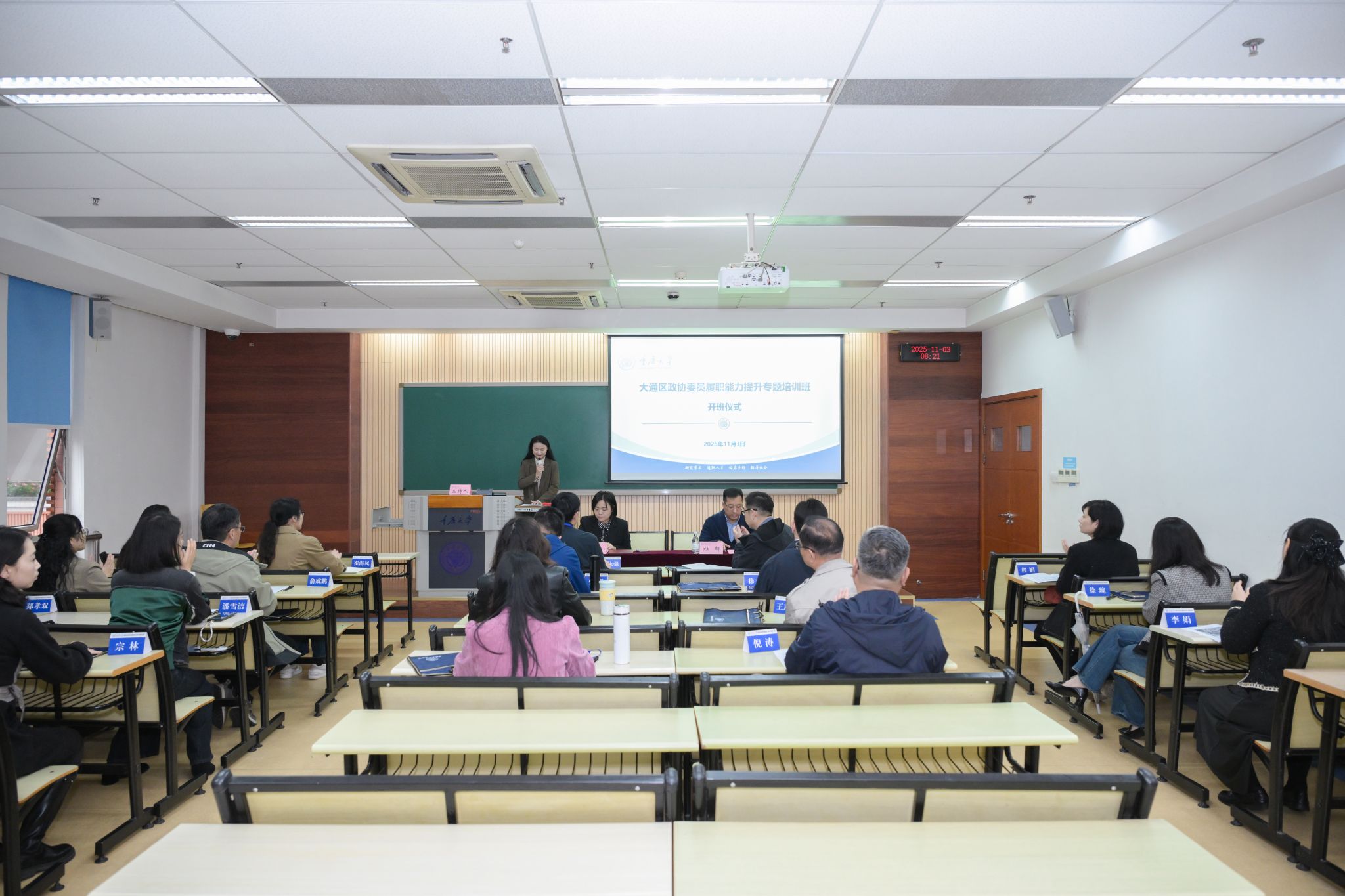2025年11月3日上午,大通区政协委员履职能力提升专题培训班在重庆大学顺利开班。重庆大学法学院副院长杜辉,大通区委常委、宣传部部长、统战部部长、区政协党组副书记王慧出席开班仪式,开班仪式由重庆大学法学院培训部老师田静主持。