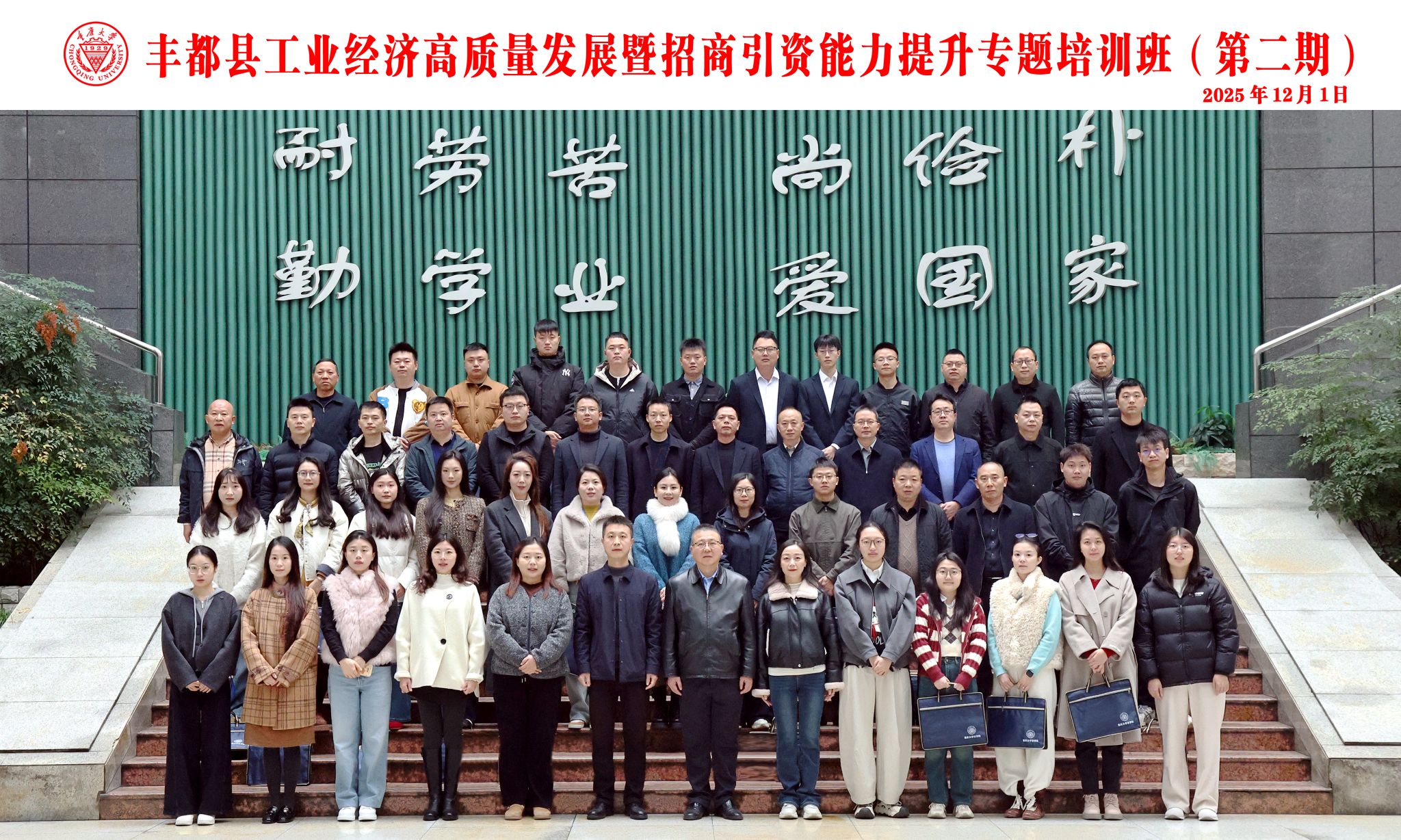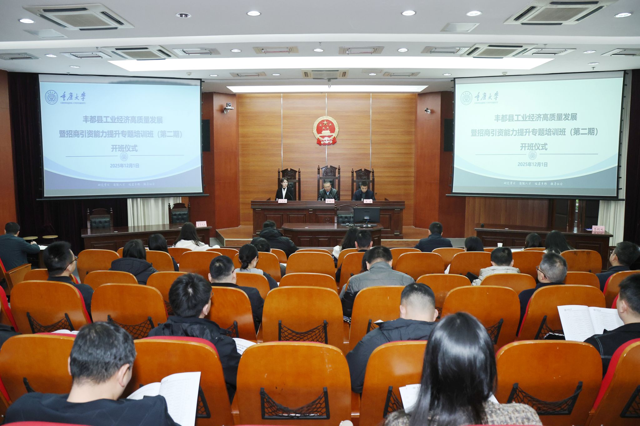 2025年12月1日上午,丰都县工业经济高质量发展暨招商引资能力提升专题培训班(第二期)在重庆大学顺利开班。重庆大学法学院党委书记蒋研川、丰都县经济合作事务中心主任黄旺出席开班仪式,全班49名学员参加,开班仪式由重庆大学法学院培训部主任向丽绢主持。
