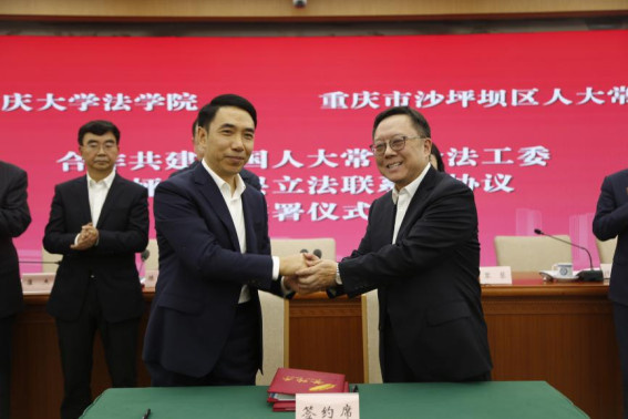 赖明才、秦鹏分别代表沙坪坝区人大常委会和重庆大学法学院签署《合作共建全国人大常委会法工委沙坪坝基层立法联系点协议》,通过共建教学科研实践基地、推进理论研究创新、培育学术活动品牌、推动资源共享等合作内容,共同打造民主立法最佳基层实践地。