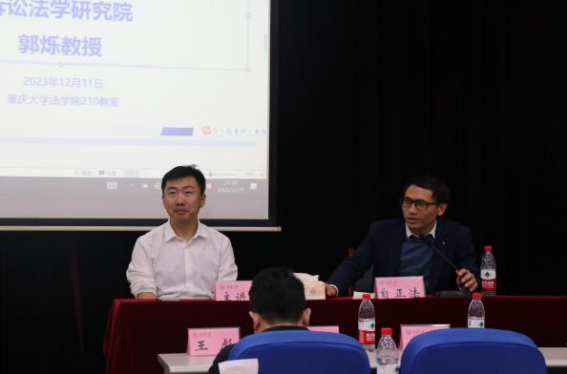 2023年12月11日,中国政法大学诉讼法学研究院教授、国家级青年人才郭烁到重庆大学法学院作“认罪认罚若干重点问题研究”讲座。西南政法大学法学院王彪副教授,重庆大学法学院党委书记蒋研川研究员、吴如巧教授、胡婧博士、周婧媛博士、杨焘博士等参加了讲座。讲座由重庆大学法学院自正法副教授主持。