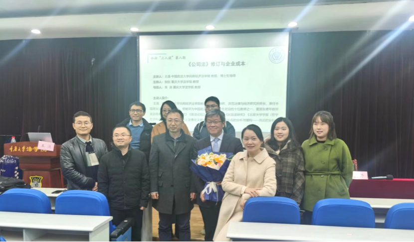 2023年12月15日,重庆大学法学院专题讲座系列之“私法三人谈”(第八期)在B区法学院210学术报告厅举行。本次会谈以“《公司法》修订与企业成本”为主题,由中国政法大学民商经济法学院王涌教授担任主讲人,重庆大学法学院张舫教授作为主持人,朱涛教授作为与谈人,王莉副教授、谢潇副教授、自正法副教授、谭津龙博士、蒋平博士、周莉欣博士、雍晨博士及百余名学生参加了本次讲座。