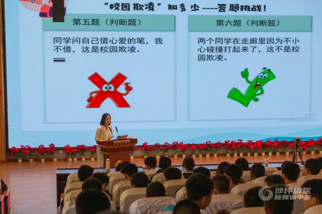 接下来,普法主题宣讲环节在礼堂和各班级教室同步开展。志愿者们围绕“究竟什么是校园欺凌、校园霸凌的主要表现形态、校园霸凌的应对举措”等方面,进行了深入浅出地阐释。在互动环节,同学们踊跃答题。志愿者张冰坤更是巧妙地以衣服上的印花“NO WAY!”作为例子,鼓舞同学们勇敢地对校园霸凌说“不”!