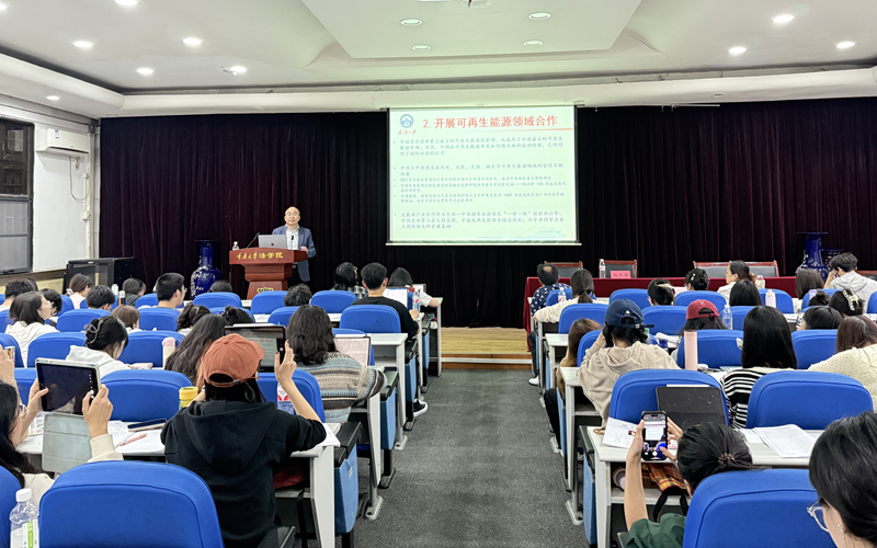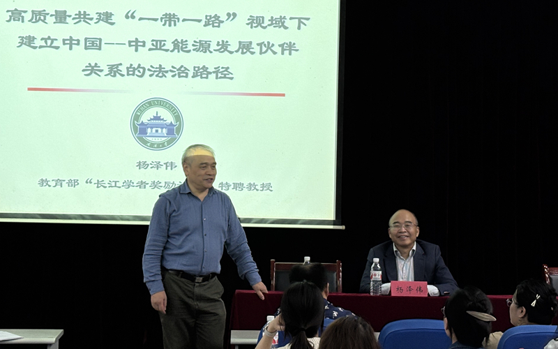 2024年10月25日晚,重庆大学国际法学科建设系列讲座之一在法学院210学术报告厅举行。国家级高层次人才、武汉大学弘毅特聘教授杨泽伟同志作题为《高质量共建“一带一路”视域下建立中国-中亚能源发展伙伴关系的法治路径》的学术讲座。讲座由重庆大学法学院国际法学科负责人胡德胜教授主持,张路教授与谈。报告厅内座无虚席,百余名师生参加了本次讲座。