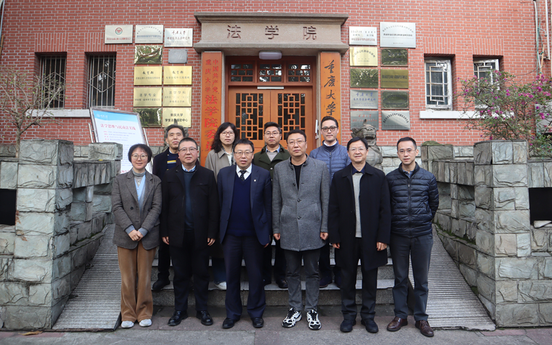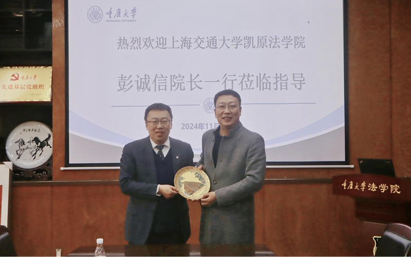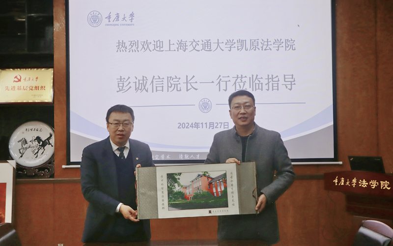 2024年11月27日,上海交通大学凯原法学院院长彭诚信、党委副书记谢玮、副院长李剑、讲席教授孙长永及党政办主任邢博等一行五人来到重庆大学法学院交流。重庆大学法学院院长靳文辉、党委副书记杨志杰、学科建设与科研管理办公室主任蒋世松、院办主任刘力强参会。