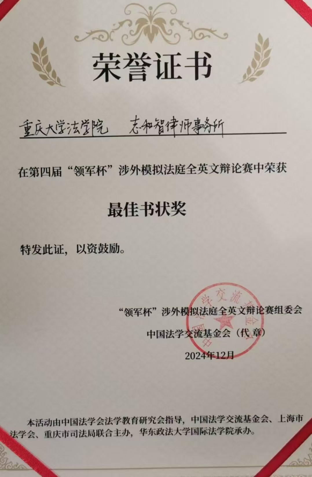 2024年第四届"领军杯"涉外模拟法庭全英文辩论赛于12月8日在华东政法大学落下帷幕。重庆大学法学院代表队凭借出色表现斩获一等奖及最佳书状奖两项殊荣,实现最佳书状奖"三连冠"。