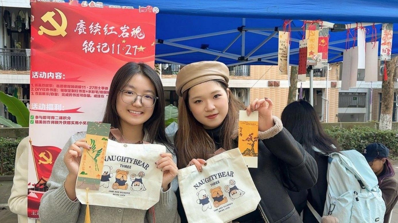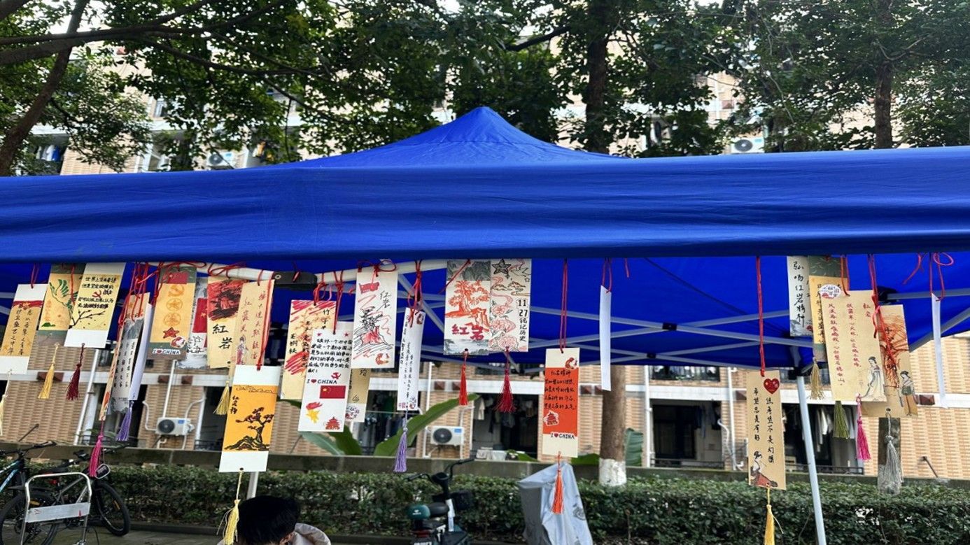 书签制作完成后,部分同学选择自留书签作为纪念。另有不少同学在志愿者的协助下,为书签系上红绳,悬挂于“纪念树”上。活动开展如火如荼,“纪念树”上展示着许多精美的书签,成为了一道绚丽的红色风景线。