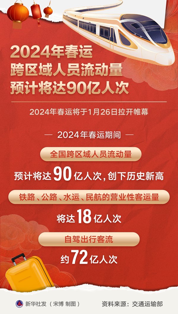 新华社北京1月16日电 2024年春运将于1月26日拉开帷幕。记者从16日召开的国新办发布会上了解到,今年春运期间全国跨区域人员流动量预计将达90亿人次,创下历史新高。