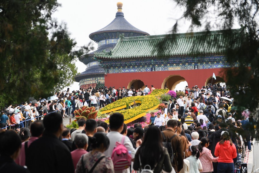10月2日,游客在天坛公园内排队前往祈年殿参观。新华社记者 鞠焕宗 摄