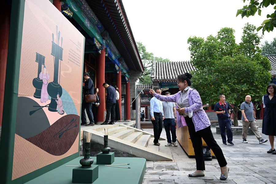 9月25日,在北京恭王府博物馆一场展览上,观众体验投壶。新华社记者 金良快 摄