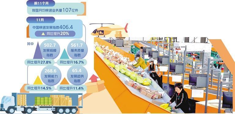国际业务不断提速是快递企业更好满足消费者寄件需求的一个缩影。经测算,11月中国快递发展指数为406.4,同比提升20%。其中发展规模指数、服务质量指数、发展能力指数和发展趋势指数分别为502.7、561.7、268.6和65.4,同比分别提升27.8%、16.7%、14.5%和11.4%。从分项指标看,预计11月快递业务量同比增速在30%左右,业务收入同比增长27%左右。