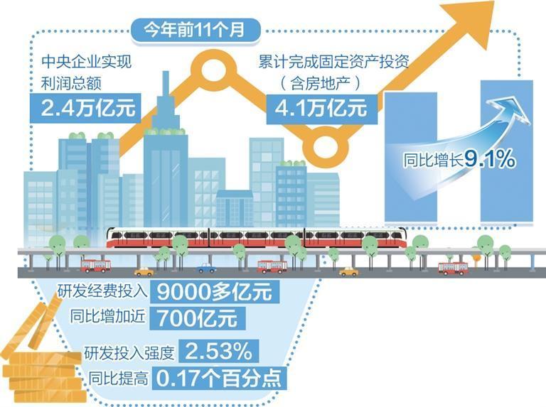 今年央企克难奋进,经营效益保持稳定,有效投资大幅增长,运行效率持续改善。前11个月,中央企业实现利润总额2.4万亿元,累计完成固定资产投资(含房地产)4.1万亿元、同比增长9.1%,年化全员劳动生产率77.3万元/人、同比增长3.8%。